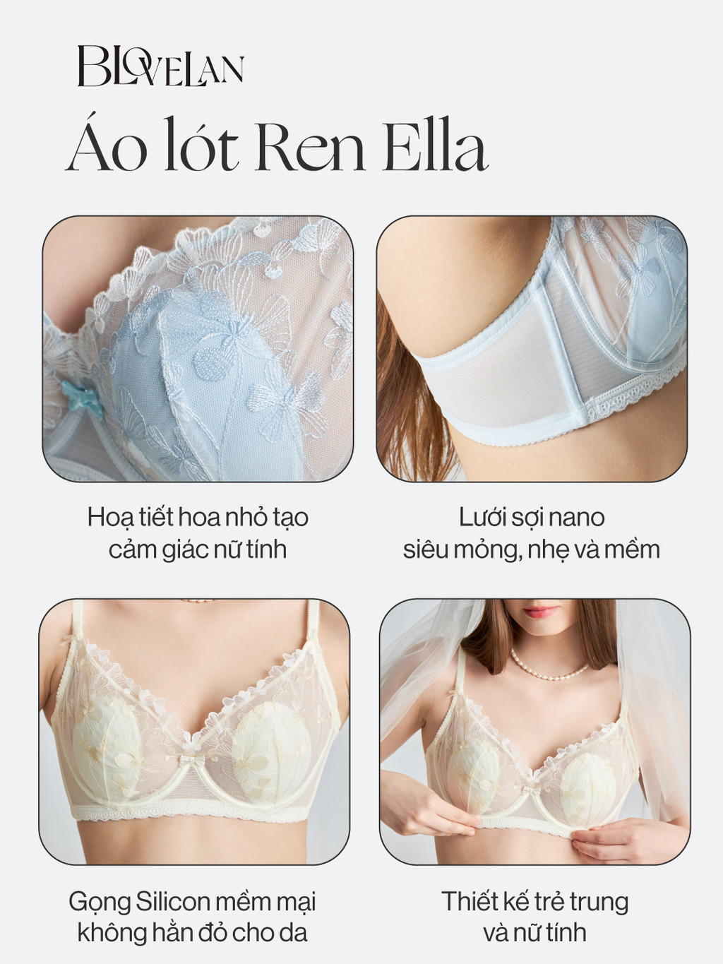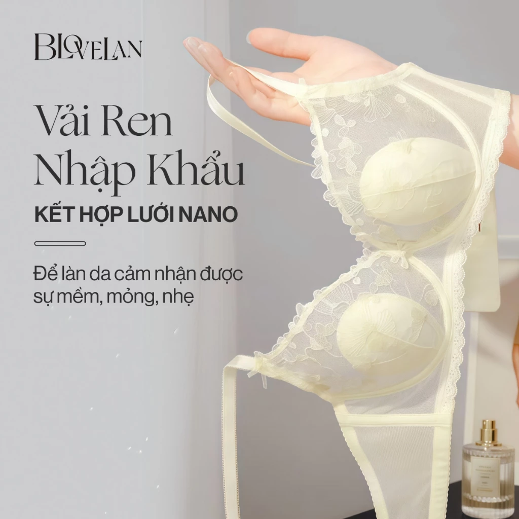 Áo ngực ren Ella BLOVELAN là lựa chọn hoàn hảo dành cho những cô nàng yêu thích sự nữ tính, ngọt ngào nhưng vẫn cần sự nâng đỡ chắc chắn và bảo vệ vòng 1 tối ưu. Thiết kế tinh tế với ren hoa nhập khẩu và gọng silicon mềm giúp giữ form ngực đẹp và chống chảy xệ hiệu quả, đồng thời vẫn tạo cảm giác nhẹ nhàng và thoải mái suốt ngày dài.